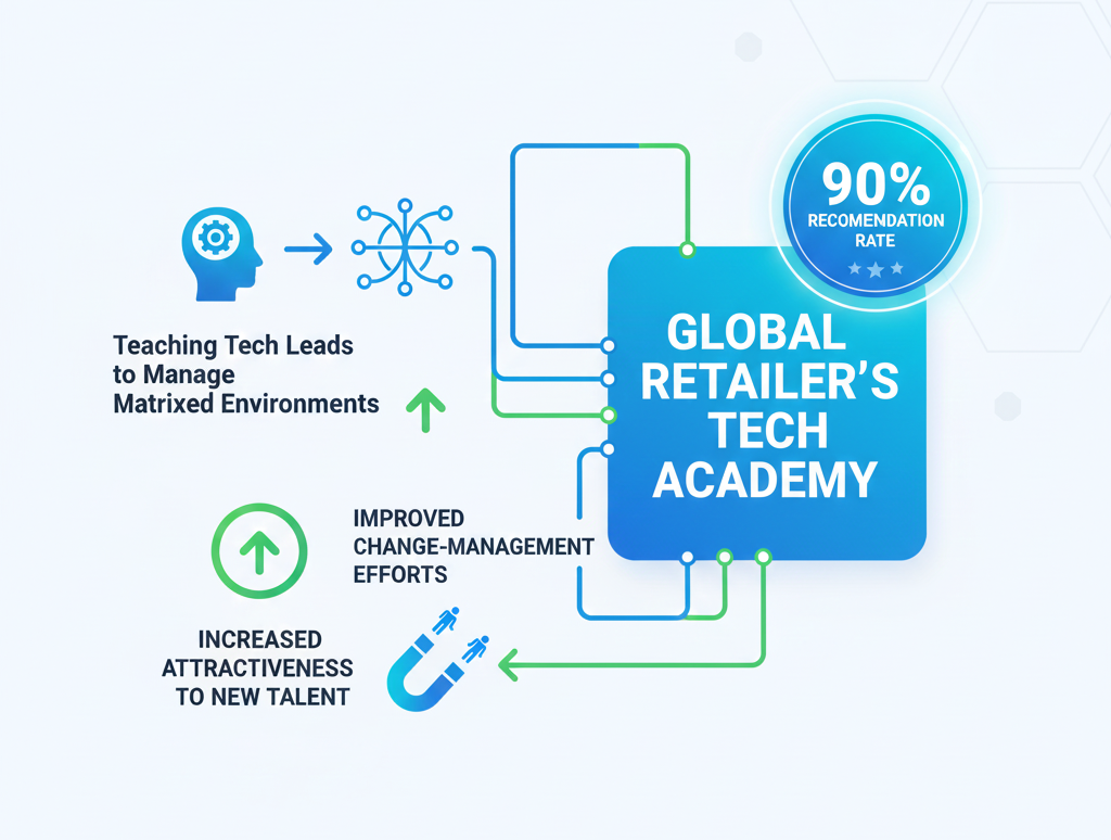 Tech talent often lacks the organizational context needed to drive change. Upskilling in this area ensures tech initiatives align with commercial goals. Complex problem-solving, storytelling, stakeholder management, and conflict resolution are focused upon. Cross-functional training is delivered that uses tangible company examples to make “soft skills” feel relevant to developers and engineers.